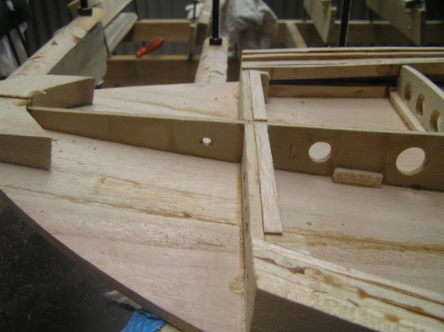 To reinforce the deck I added little intermediate ribs which were about 5mm wide by 12 mm deep - these were notched into the spine & the chines - also glued 6mm square balsa cross pieces to all the ribs to increase glue join- next up I glued on the deck skins which are 6mm thick